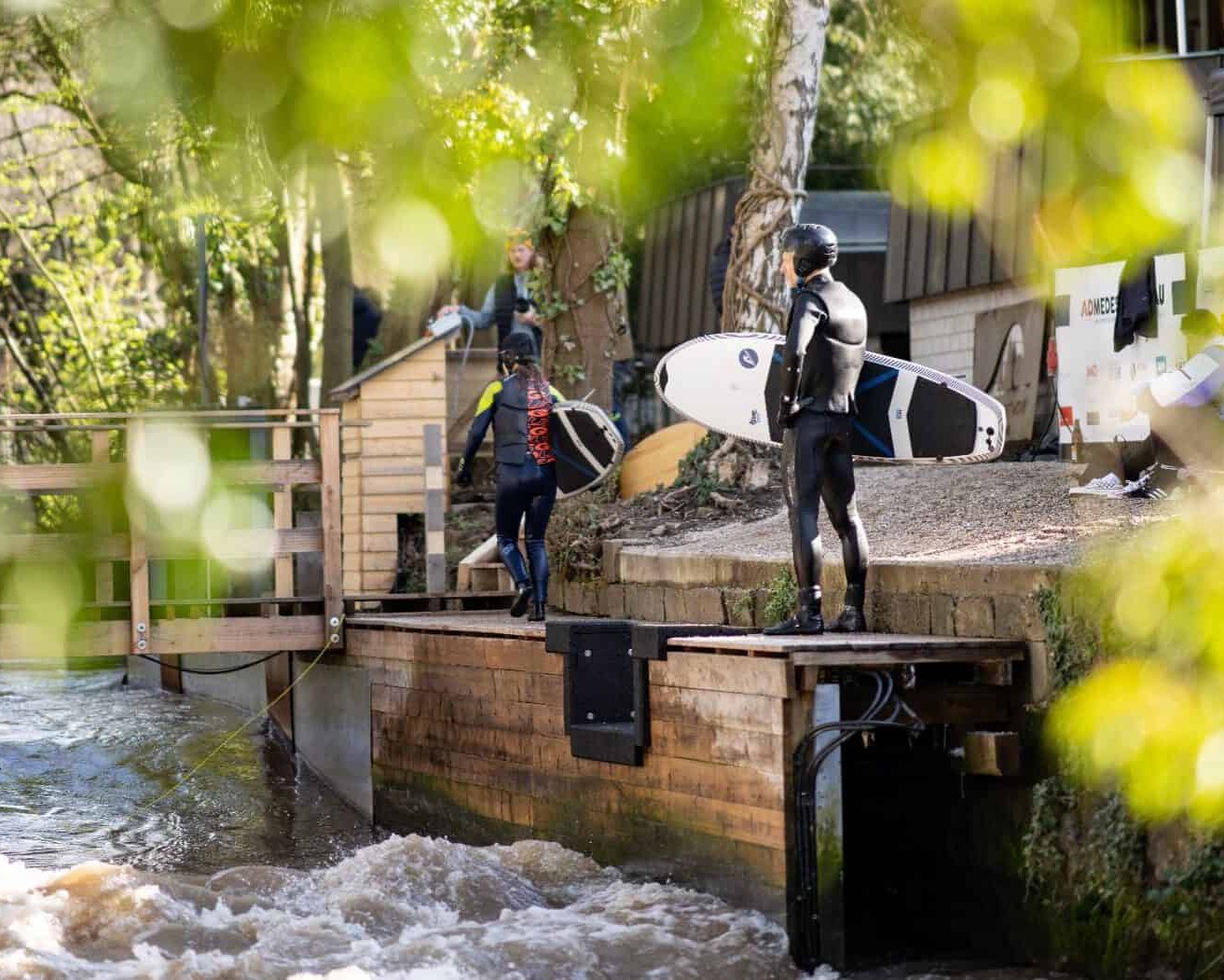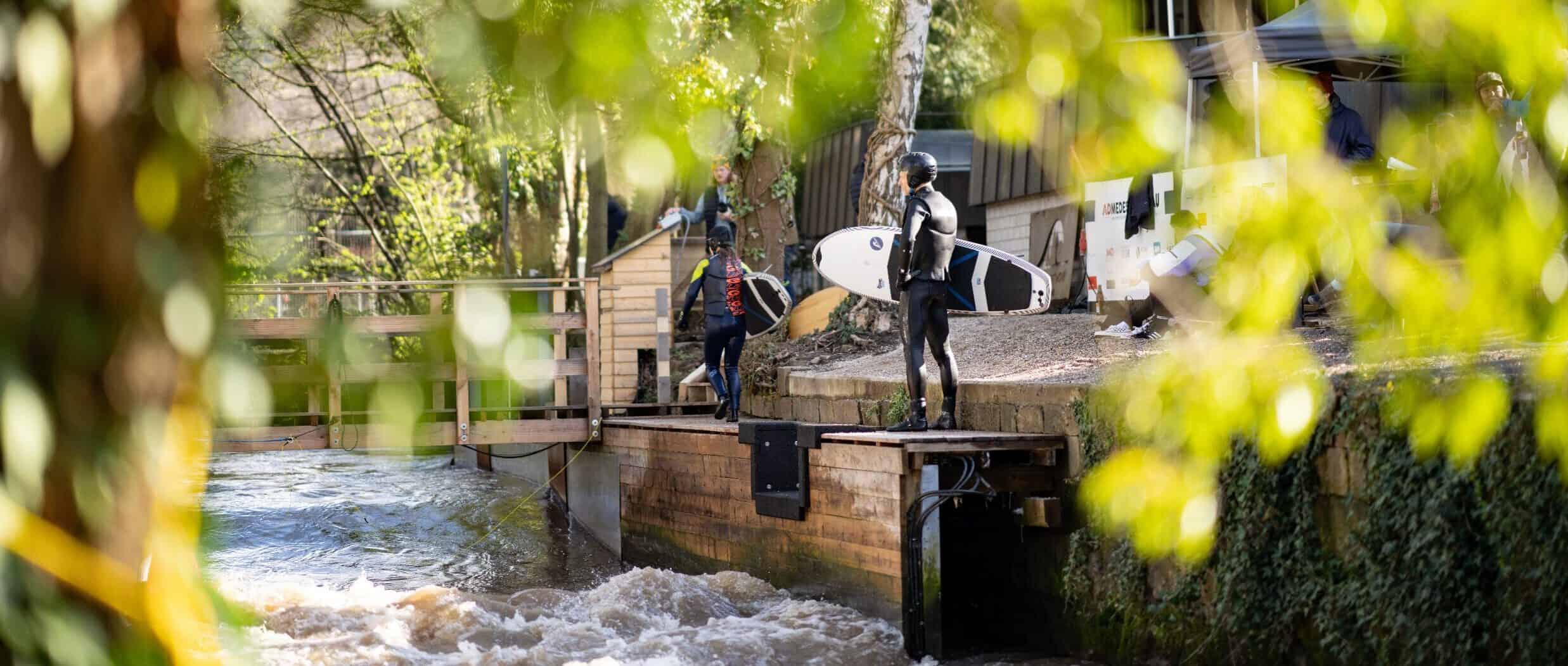 Unser bisher größtes Projekt: Der Bau der blackforestwave. Damit ist River Surfing jetzt mitten in der Stadt Pforzheim möglich. Seit September 2021 surfen wir Vereinsmitglieder auf der stehenden Flusswelle am Rande des Schwarzwalds. Meist wird am Wochenende gesurft, vereinzelt auch unter der Woche nach Feierabend. Seit Frühjahr 2022 werden zu speziellen Events auch online buchbare Surfslots für Nicht-Mitglieder angeboten.